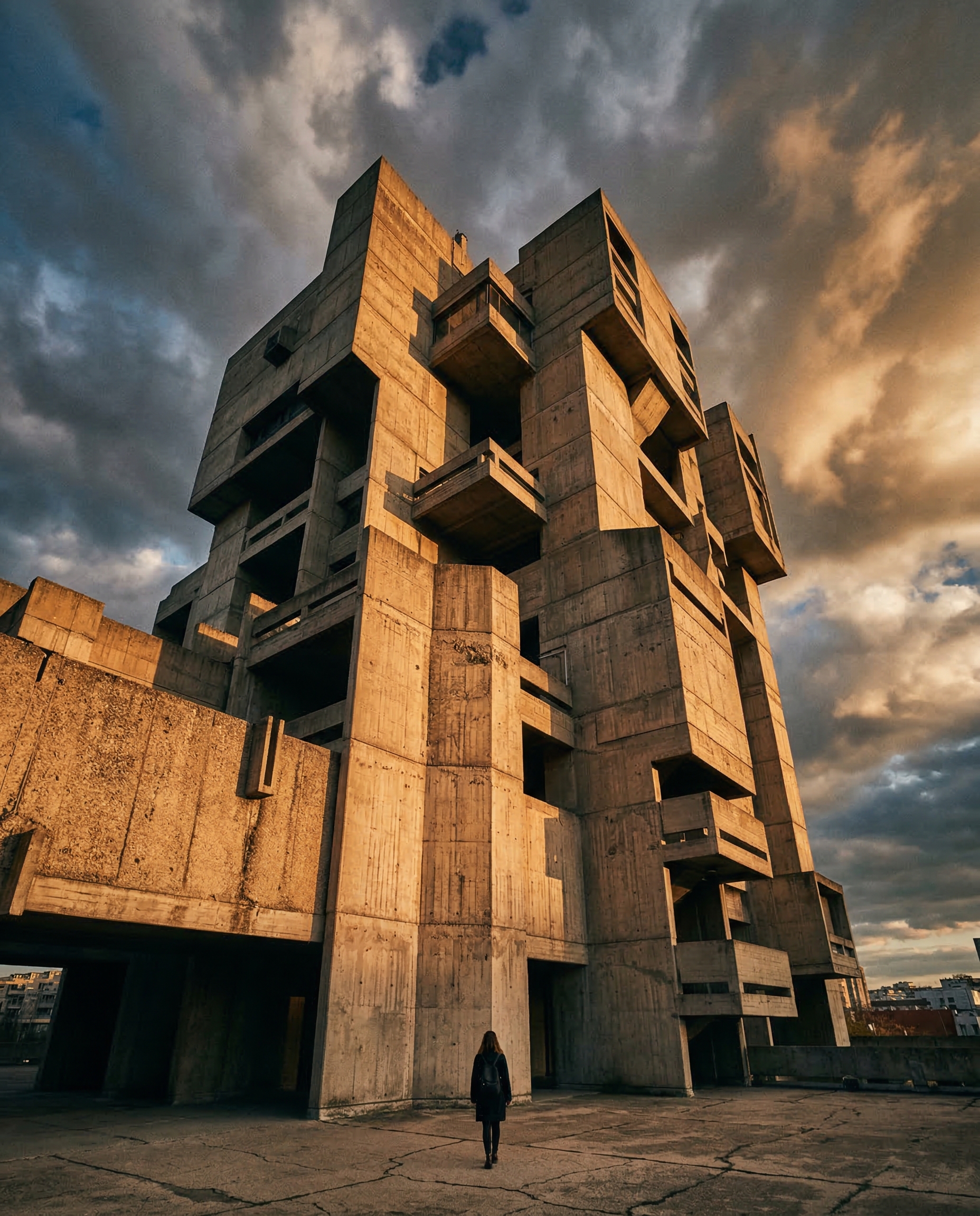 Imagen cinematográfica de brutalismo, marco editorial, punto naranja, línea tierra, label en Space Mono. La imagen transmite solidez, el texto transmite convicción.